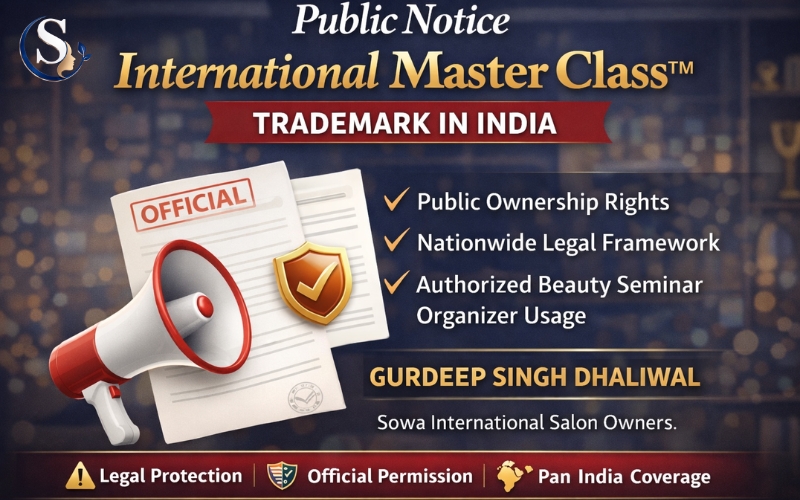 Official Public Notice for International Master Class™ Trademark in India – Legal rights, nationwide protection, and authorized usage for beauty seminar organizers.