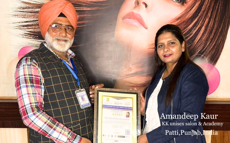 Amandeep Kaur, Professional Makeup Artist from KK Unisex Salon and Academy, Patti (Punjab), receiving her Sowa International Salon Owners Welfare Association (Regd.) membership certificate from State Coordinator S. Nirmal Singh Panju.