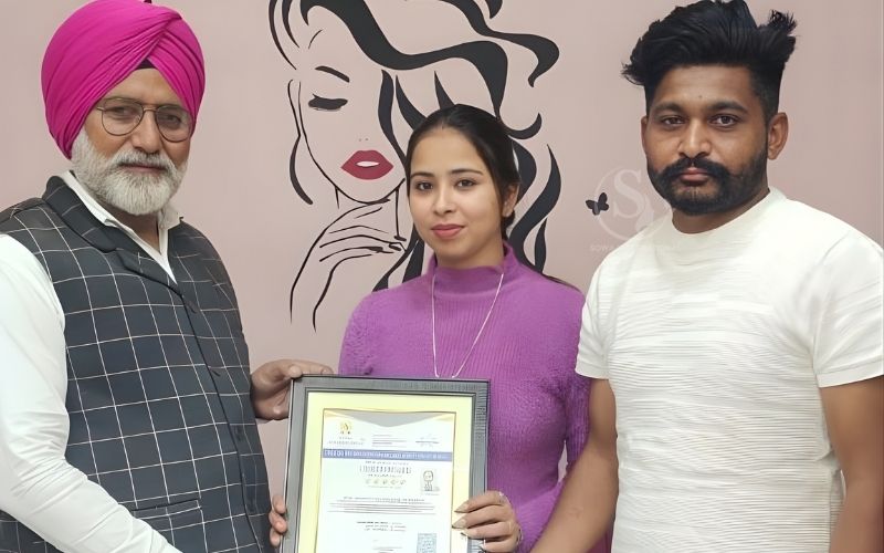 Sowa International Punjab State Coordinator Nirmal Singh Panju presenting Sowa Membership Certificate to salon owner